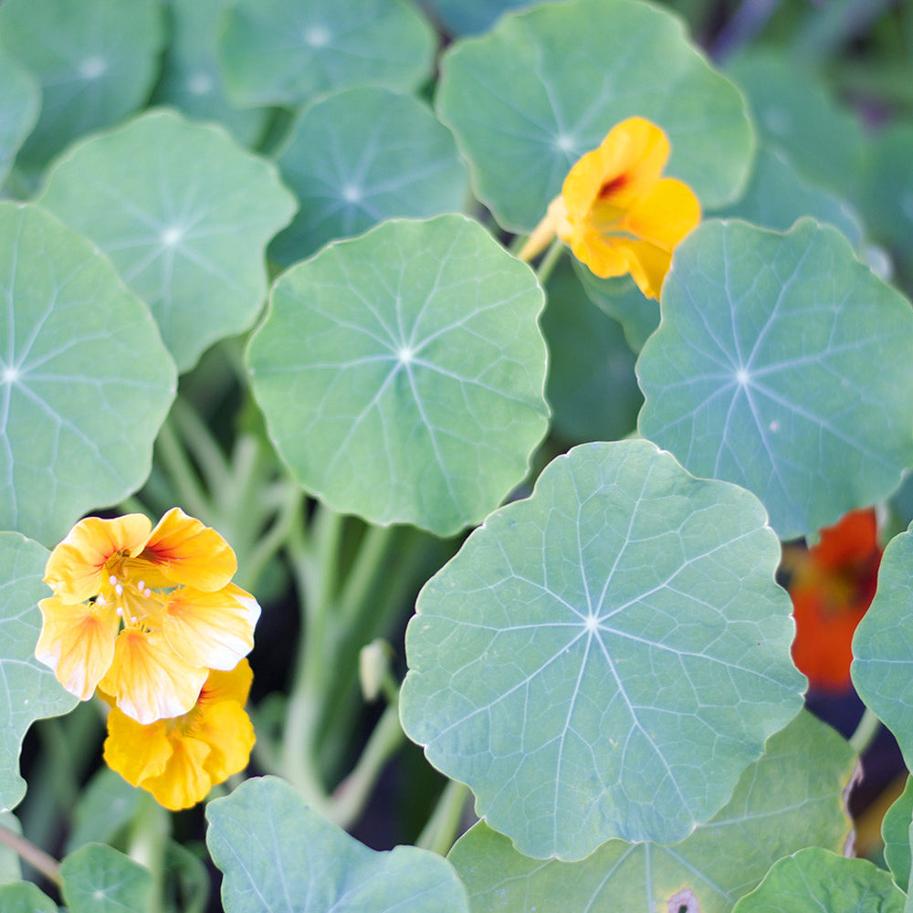 Nasturtium: This plant grows wild all over the front and back yard of the house we rent. It is a sprawling vine with large flat, veined leaves and five-petaled flowers in yellow, orange and red. The flowers are commonly found in salad blends at the farmers' market and have a delicious mustard-like, spicy flavor. You can also eat the leaves which are can make a great cooked green.