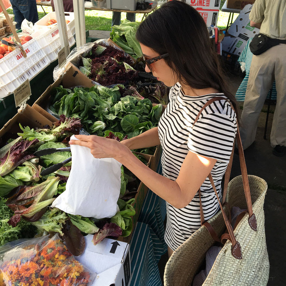 Cotton Produce Bags: We bring two kinds of cotton produce bags to the market, muslin for our greens and mesh for loose veggies and fruit. We take about 10 total and transfer most of the bags directly into our fridge crisper drawer when we get home. I like to give the muslin bags a little spritz of water to keep greens crisp.