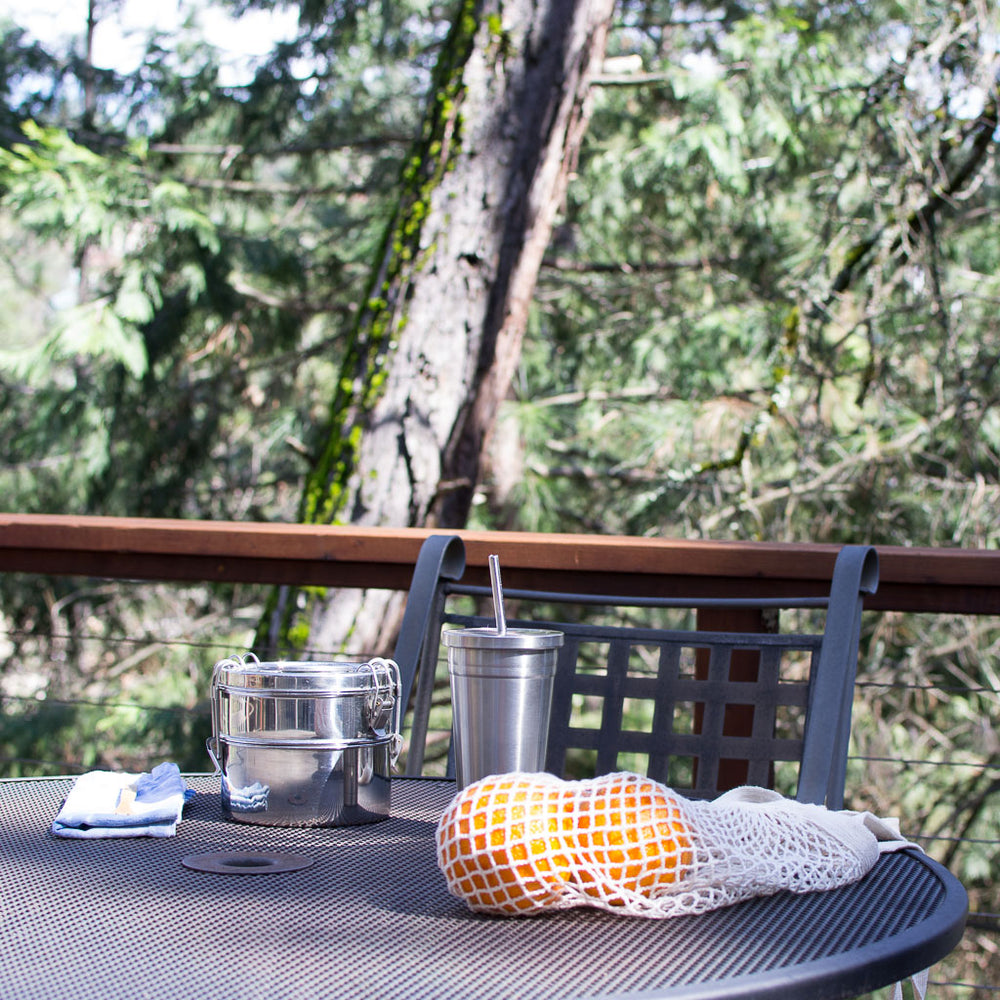 Max and I love going to the Farmer’s Market every week and often treat ourselves to brunch at one of the food trucks. Instead of using the paper trays, napkins and plastic cutlery the truck provides, we bring reusable alternatives—a 2-tier stainless steel tiffin (one half for Max, one half for me), two cloth napkins, and one set of bamboo cutlery (I’ll use the chopstick or spoon and Max will use the fork or vice versa). I also might bring a stainless steel tumbler for a green smoothie instead of using the compostable plastic tumbler and straw the stand provides. I love that the tumbler is insulated as well, keeping my smoothie nice and cold on a hot day.