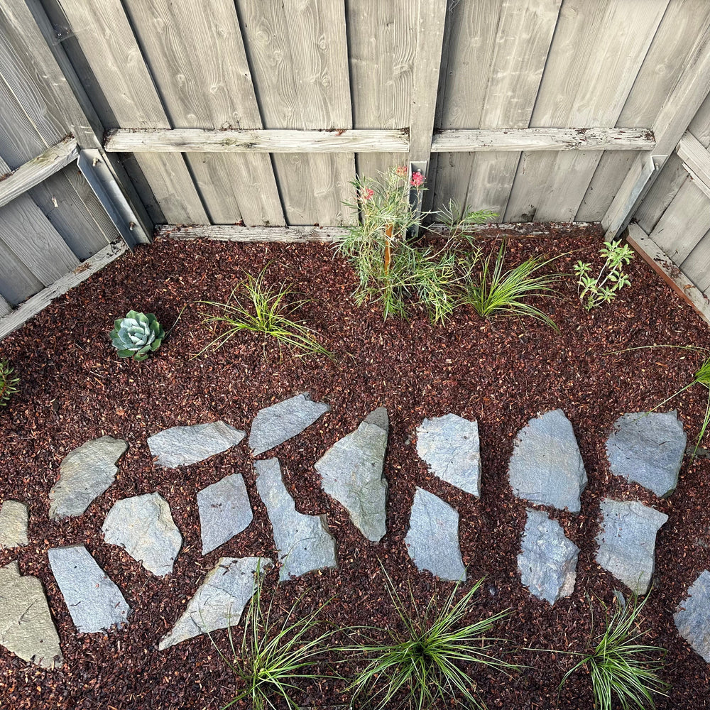 We reconfigured the flagstones to create a winding path and added some steps along the sloped side of the garden. We primarily used a mix of low-water plants from Australia and New Zealand and California natives. We also saved one of the Jade plants to pay homage to the previous owner.