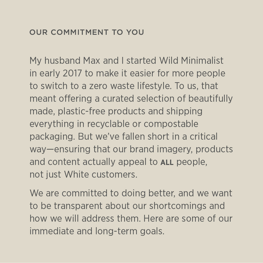 My husband Max and I are both White. We started Wild Minimalist in early 2017 to help make it easier for more people to switch to a low waste lifestyle. To us, that meant offering a curated selection of beautifully made, plastic-free products and shipping everything in recyclable or compostable packaging. But we’ve fallen short in a critical way—ensuring that our brand imagery, products and content actually appeal to ALL people, not just White customers.